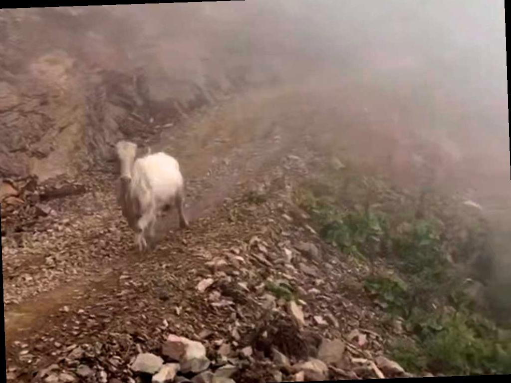 Группа туристов столкнулась с дикой коровой на узкой каменистой тропе. Животное приближалось к ним быстрым шагом, не сводя взгляда с оператора, и вызывало некоторую тревогу.